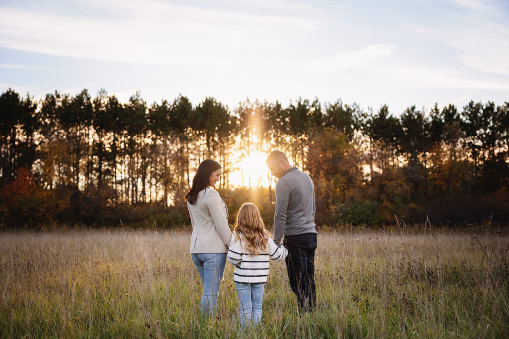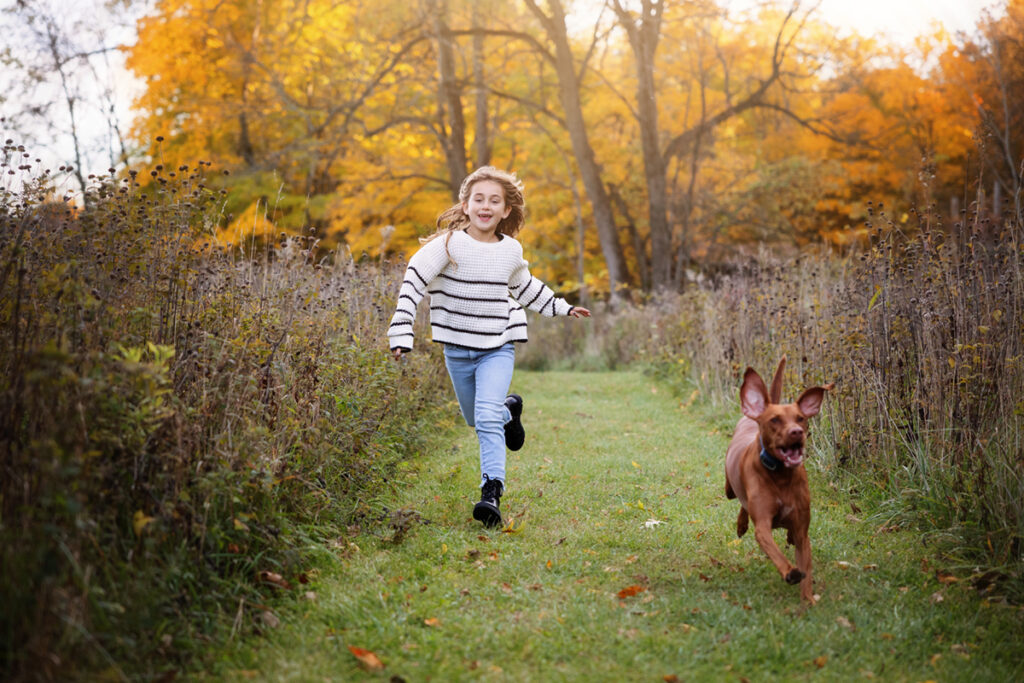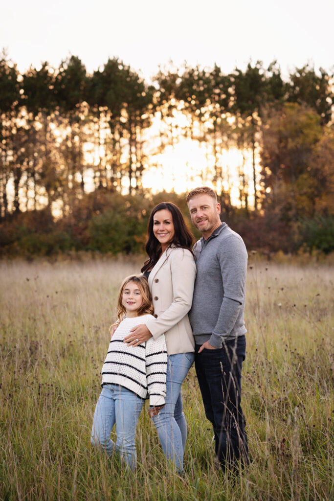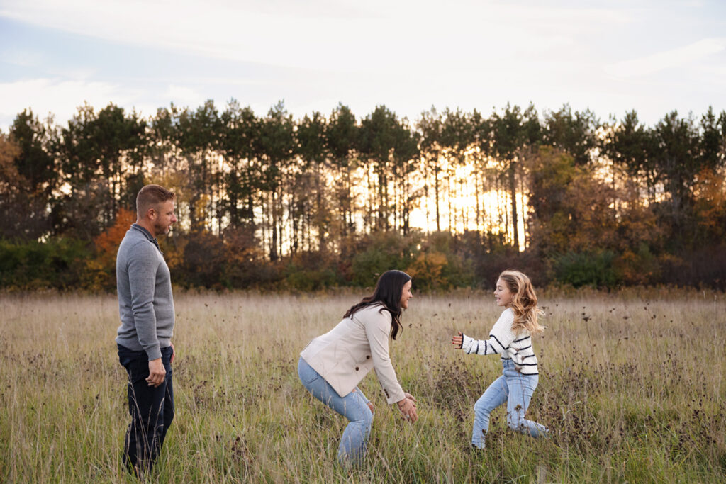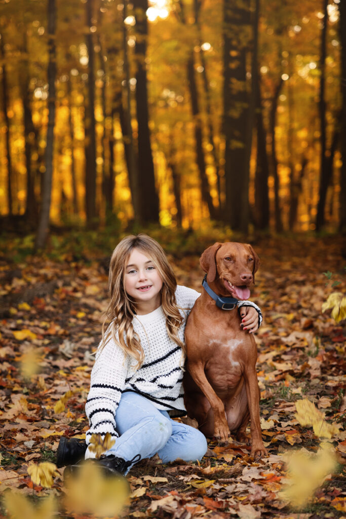 Fall Colors, exploration and sunset with this beautiful family! I had so much fun meeting and documenting memories for these three and their furry friend last year… I was honestly a little worried about topping those photos we got with the amazing sunset! But we explored a different forest preserve this time around, we had some more Fall leaves on the ground and they went with a different look with their attire. And with this little explorer, it was so easy to capture some amazing moments because she’s so bright and full of energy and excitement! Really, I gave some gentle prompts here and there, but most everything that was perfect was her. She sort of directs the flow, which is awesome!
